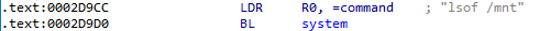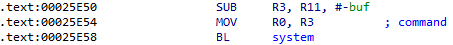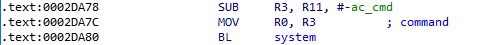 The first line subtracts the immediate value “-ac_cmd” (256 bytes) from the value stored in register R11 and stores the result in register R3. R3 is them moved into R0, and System() function uses R0 as its argument.