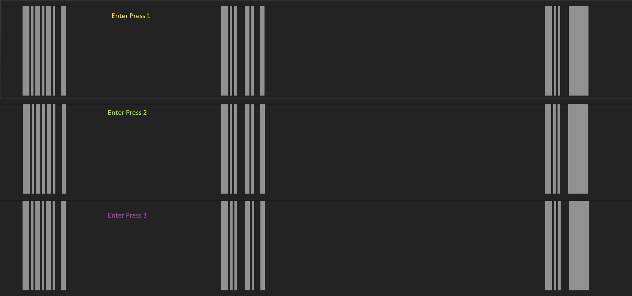 So what i did here was cut up the 3 key presses and layered them to see if the same sequences were present on each keypress and the same timing. well yes infact they are they same, however depending on the human factor and the fat finger, depends on how long the data stream is!