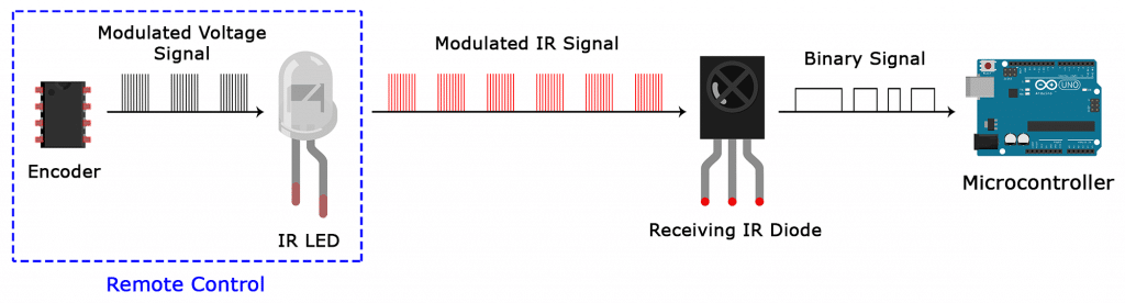 Because IR is a type of light, IR communication requires a direct line of sight from the receiver to the transmitter. It can’t transmit through walls or other materials like WiFi or Bluetooth.