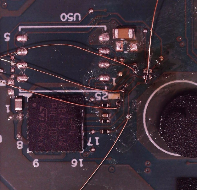 Thin 0.1 mm wires were soldered to the relevant SPI pins, MISO, MOSI, CLK and CS. These were then secured with hot glue to prevent detachment while reassembling the laptop.